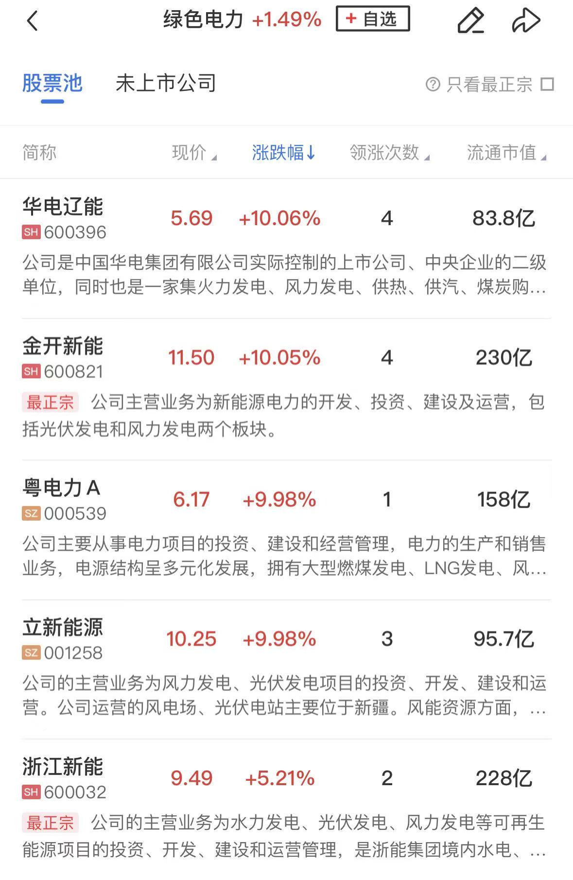 绿色电力板块延续强势,华电辽能、金开新能、粤电力A、立新能源、韶能股份等个股涨停,珈伟新能、浙江新能、节能风电等涨幅居前。