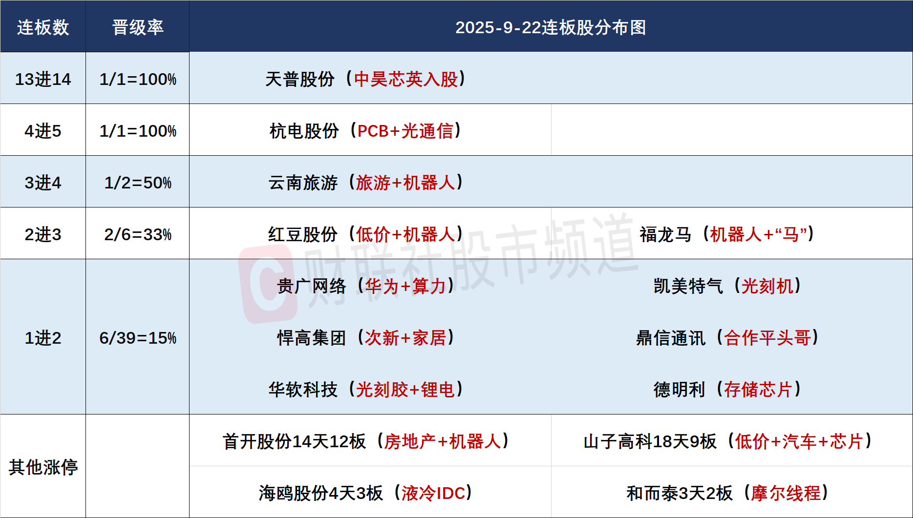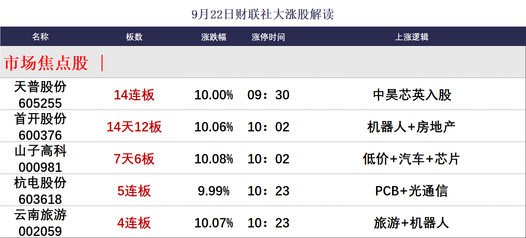 9月22日讯,今日65股涨停,19股炸板,封板率为77%,天普股份14连板,杭电股份5连板,云南旅游4连板,红豆股份、福龙马3连板,首开股份14天12板,山子高科7天6板,海鸥股份、凯美特气4天3板。市场全天震荡拉升,三大指数均收涨。在芯片概念股的带领下,科创50指数盘中一度涨逾4%。沪深两市成交额2.12万亿,较上一个交易日缩量2023亿。板块方面,贵金属、芯片产业链、消费电子等板块涨幅居前,影视院线、旅游、白酒等板块跌幅居前。截至收盘,沪指涨0.22%,深成指涨0.67%,创业板指涨0.55%。