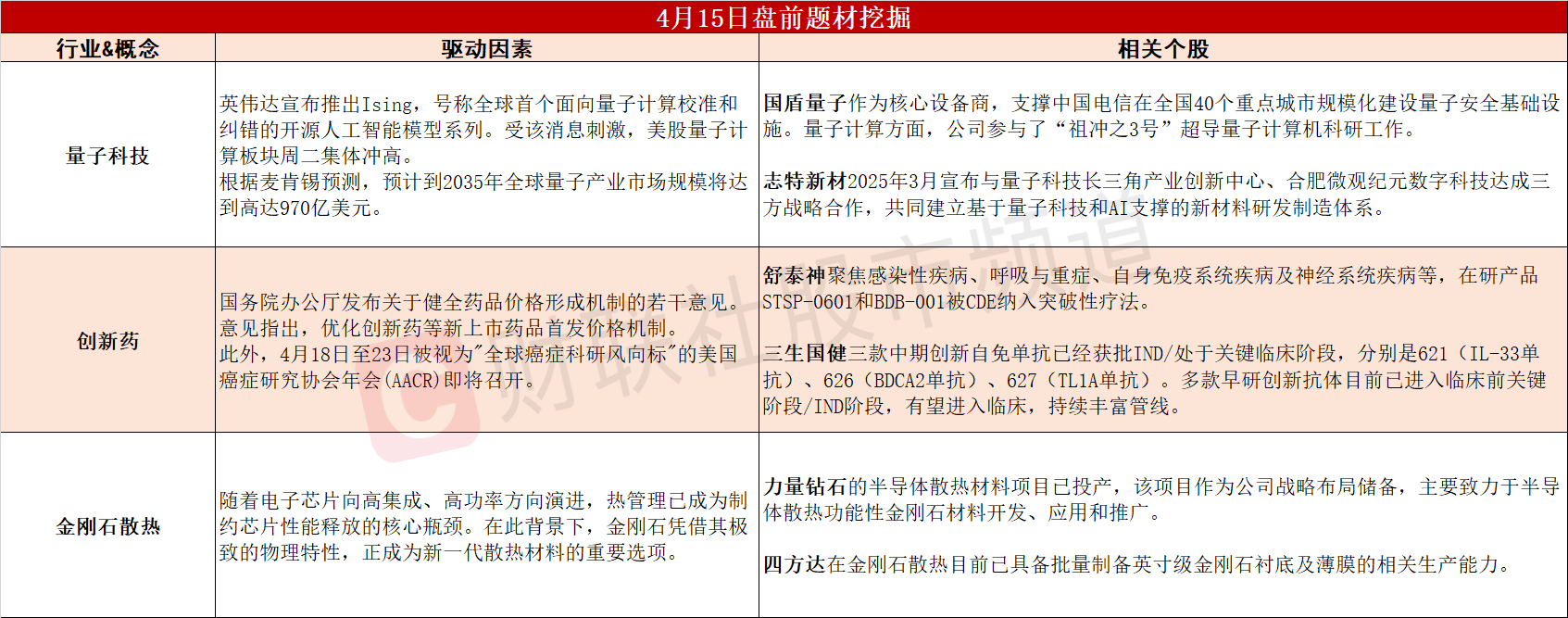 【盘前题材挖掘】①英伟达推出面向量子计算的AI模型,全球量子科技产业加速发展。②国务院办公厅发文支持创新药发展,创新药板块近期迎来多重催化。③新一代散热材料的重要选项,金刚石散热或迈入产业化应用阶段。
