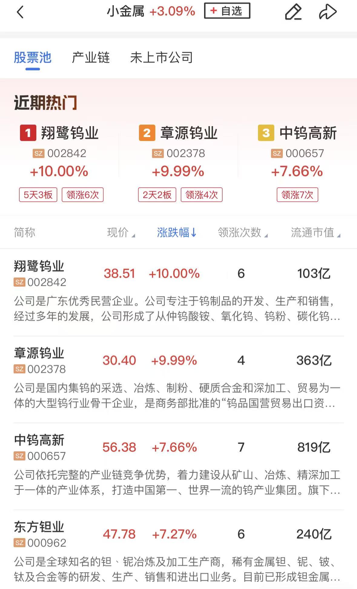 有色金属板块持续活跃,翔鹭钨业5天3板,章源钨业2连板,东方钽业、盛和资源、宝钛股份、厦门钨业等涨幅居前。 消息面上,近两周,黑钨精矿价格上涨25.19%至67.1万元/吨,仲钨酸铵价格上涨24.68%至98.5万元/吨。