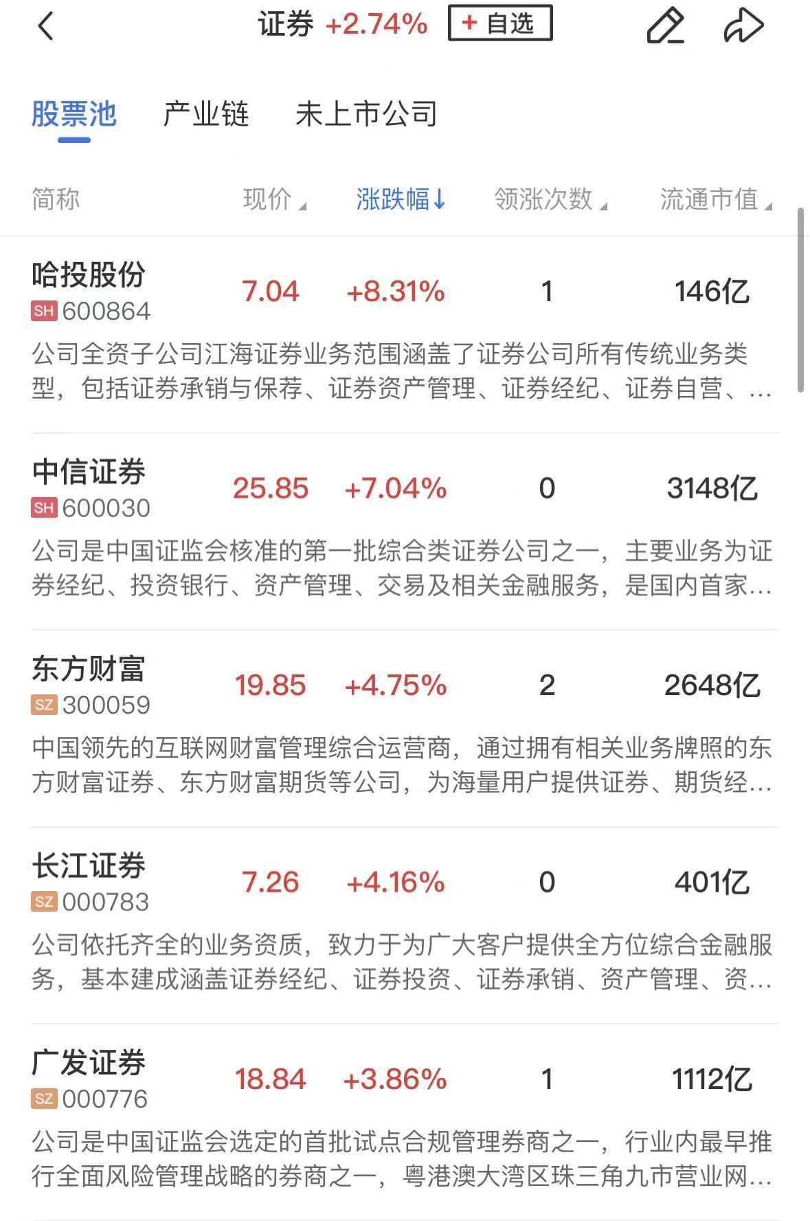 券商股集体爆发,中信证券涨超7%,哈投股份、东方财富、长江证券、广发证券、兴业证券跟涨。