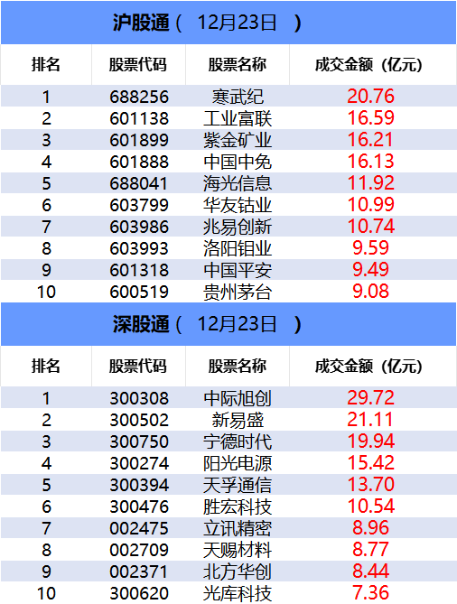 从沪股通前十大成交个股来看,寒武纪位居首位;工业富联和紫金矿业分居二、三位。