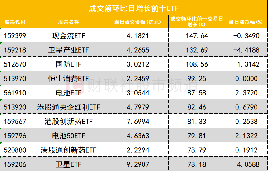 从成交额环比增长前十的ETF来看,现金流ETF(159399)成交额环比增长147%位居首位;卫星产业ETF(159218)成交额环比增长132%位居次席。