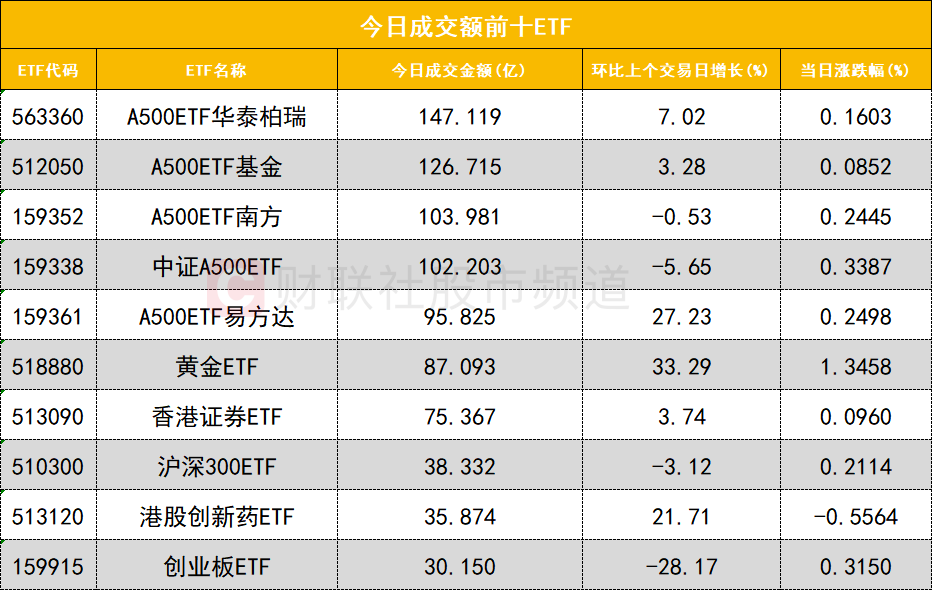 从成交额前十的ETF来看,A500ETF华泰柏瑞(563360)成交额位居首位,A500ETF基金(512050)成交额位居次席。