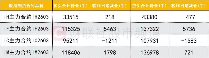 四大期指主力合约中,IF、IM合约多空双方均加仓,IM合约多头加仓数量较多。IH合约多头加仓而空头减仓。