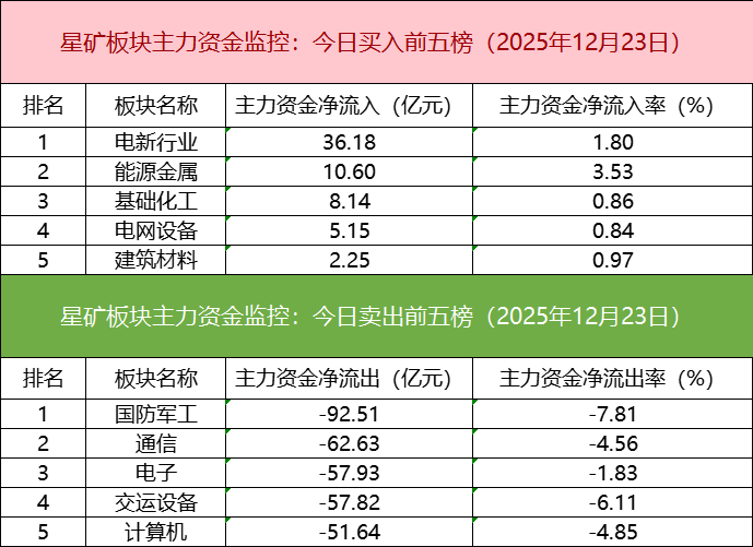 从主力板块资金监控数据来看,电新行业主力资金净流入居首。