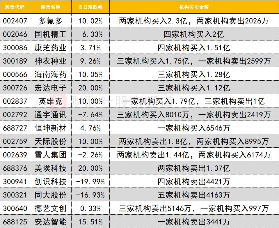 今日龙虎榜机构活跃度明显提升,买入方面,锂电池概念股多氟多获两家机构买入2.3亿,同时遭两家机构卖出2026万。多只海南自贸概念股获机构抢筹,其中康芝药业获四家机构买入1.51亿,神农种业三家机构买入1.75亿,海南海药获三家机构买入1.28亿。