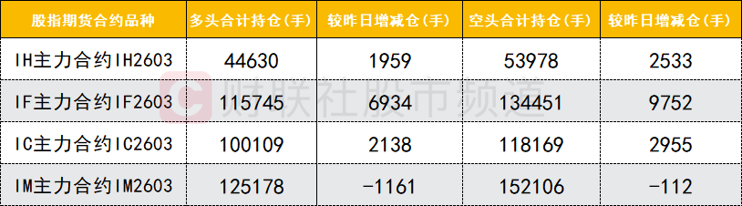 四大期指主力合约中,IH、IF、IC合约多空双方均加仓,IF合约空头加仓数量较多。