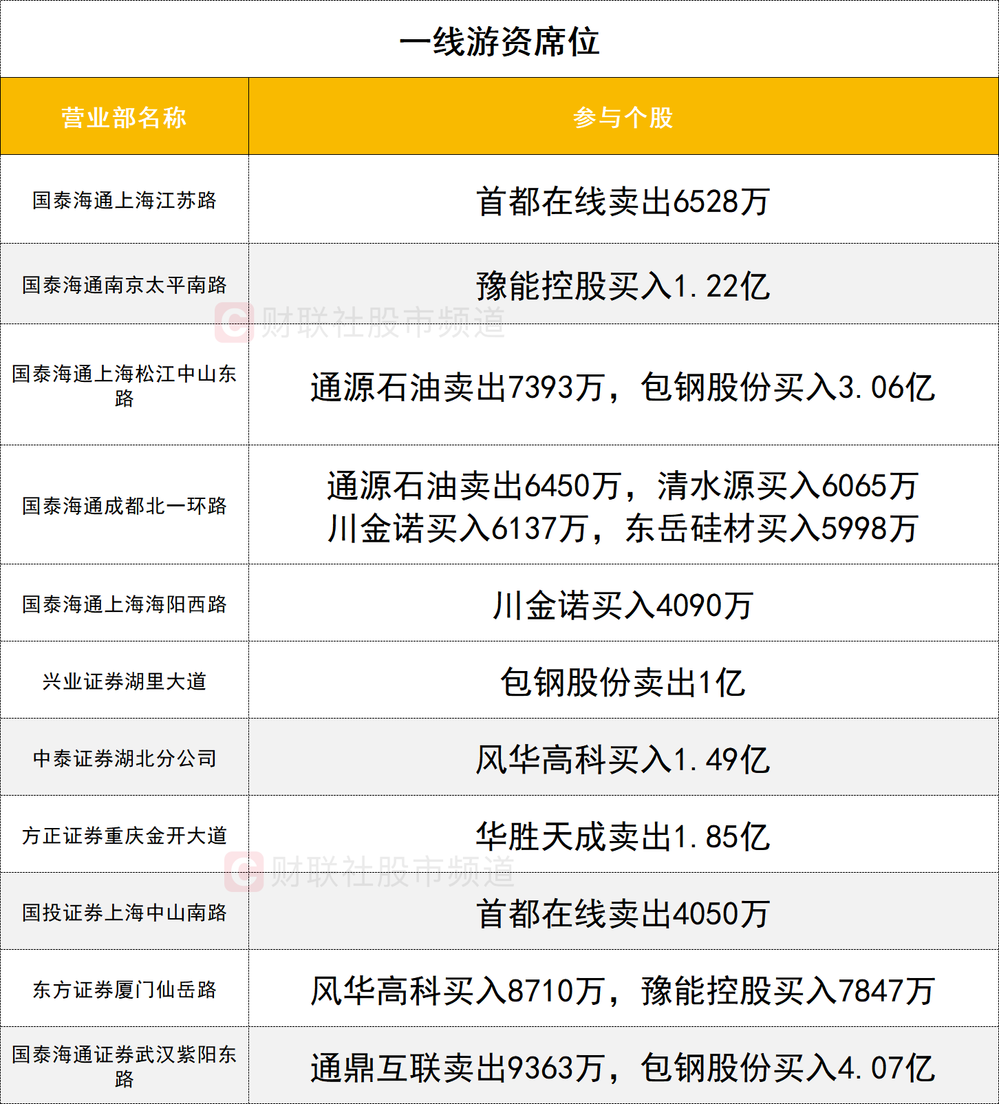 一线游资活跃度较高,通源石油遭两家一线游资(国泰海通证券上海中山东路、国泰海通证券成都北一环路)合计卖出1.38亿。东岳硅材获一家一线游资(国泰海通证券成都北一环路)买入0.59亿。