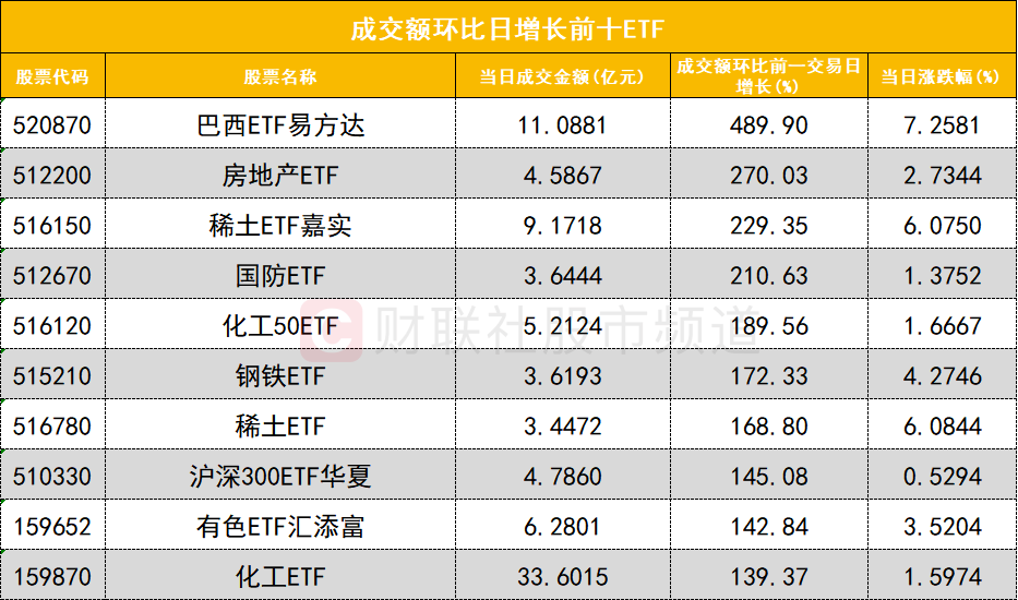 从成交额环比增长前十的ETF来看,巴西ETF易方达(520870)成交额环比增长489%位居首位;房地产ETF(512200)成交额环比增长270%位居次席。