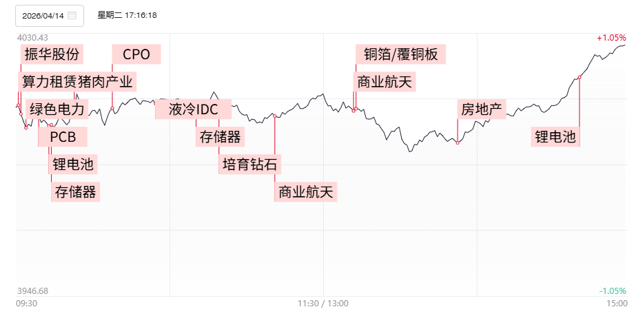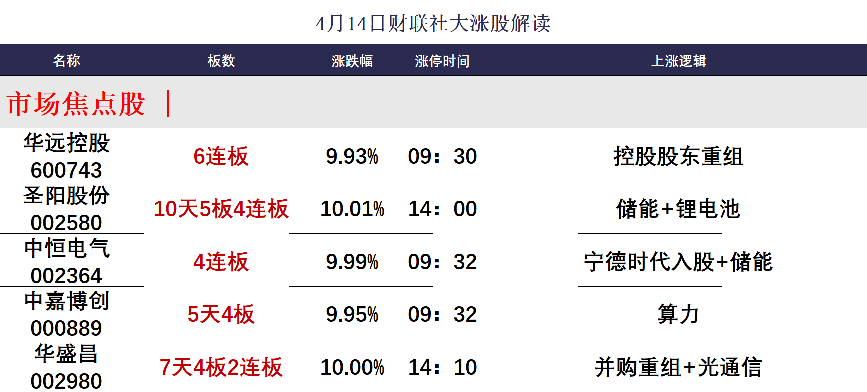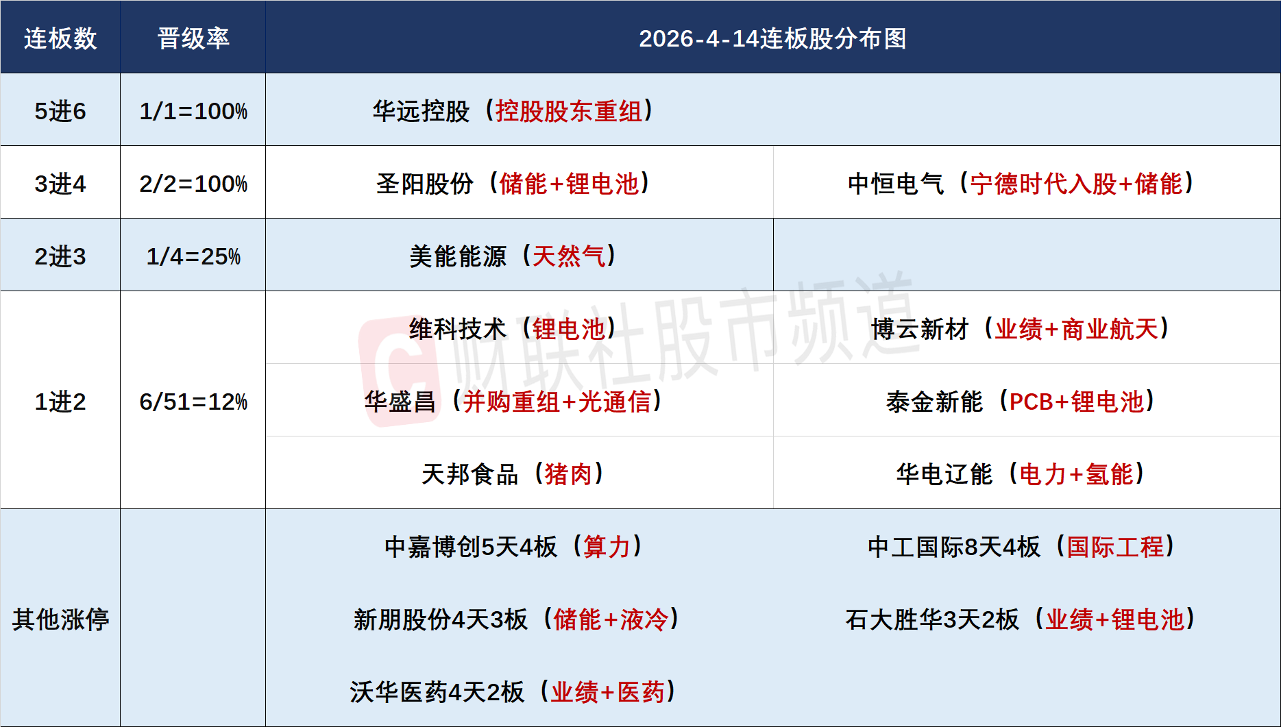 4月14日讯,今日55股涨停,18股炸板,封板率为75%,华远控股6连板,圣阳股份、中恒电气4连板,美能能源3连板,华盛昌11天5板,中嘉博创5天4板,新朋股份4天3板。市场震荡反弹,创业板指涨超2%,续创阶段新高,沪指涨近1%重返4000点,深成指涨超1.5%。沪深两市成交额2.38万亿,较上一个交易日放量2334亿。盘面上,市场热点快速轮动,全市场超3700只个股上涨。板块方面,商业航天、能源金属、存储芯片、猪肉板块领涨;油气设服、汽车整车、煤炭、酒店餐饮板块领跌。截至收盘,沪指涨0.95%,深成指涨1.61%,创业板指涨2.36%。