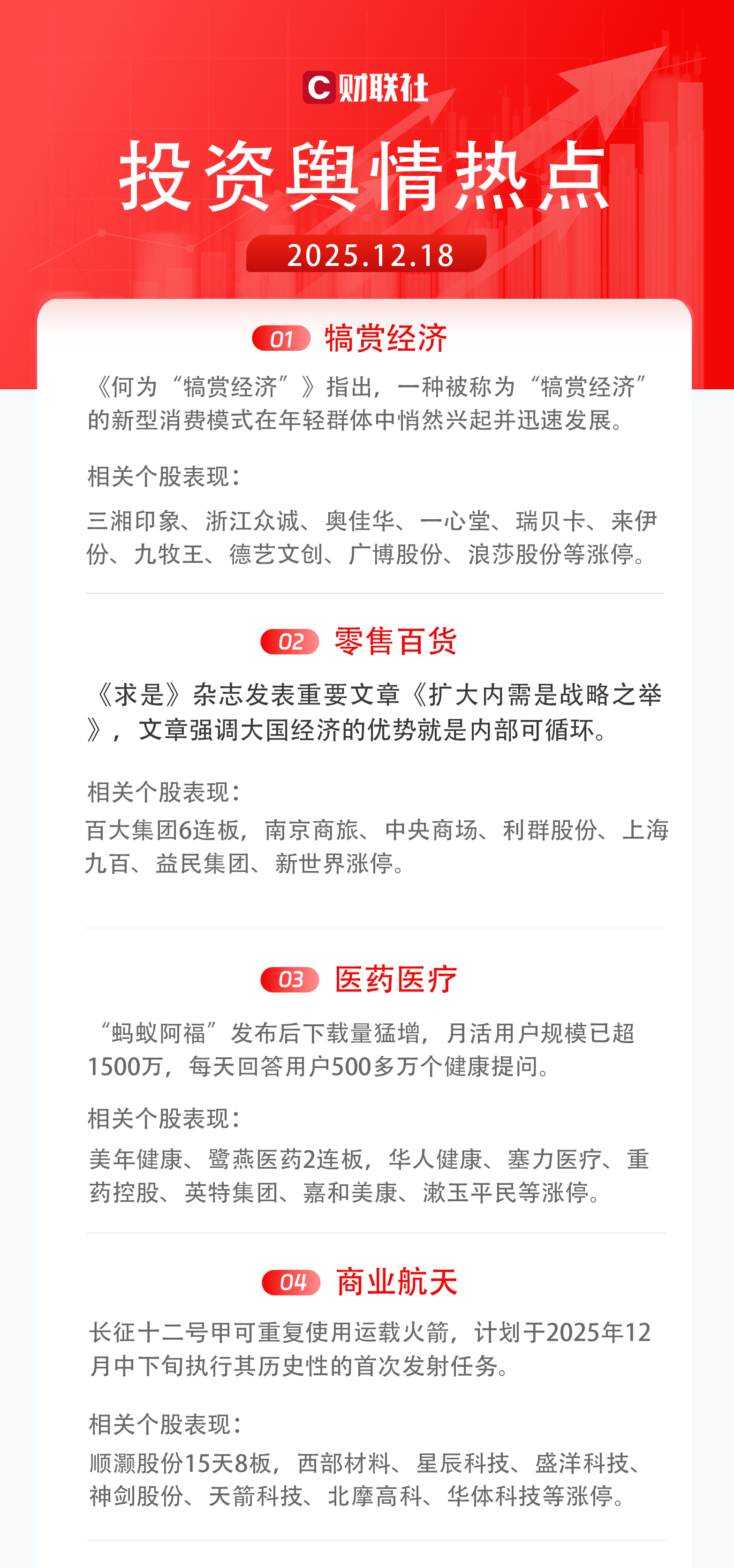 【今日投资舆情热点】 1)犒赏经济:《学习时报》发表文章《何为“犒赏经济”》指出,一种被称为“犒赏经济”的新型消费模式在年轻群体中悄然兴起并迅速发展,成为拉动内需、扩大消费的新引擎。 2)零售百货:《求是》杂志发表重要文章《扩大内需是战略之举》,文章强调大国经济的优势就是内部可循环。 3)医药医疗:“蚂蚁阿福”发布后下载量猛增,月活用户规模已超1500万,每天回答用户500多万个健康提问。 4)商业航天:长征十二号甲可重复使用运载火箭,计划于2025年12月中下旬在酒泉卫星发射中心执行其历史性的