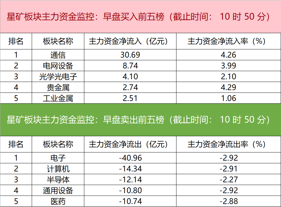 【主力资金监控:N摩尔-U净买入超19亿】财联社12月5日电,财联社星矿数据显示,今日早盘主力资金净流入通信、电网设备、光学光电子等板块,净流出电子、计算机、半导体等板块,其中电子板块净流出超40亿元。个股方面,N摩尔-U大涨,主力资金净买入超19.78亿元位居首位,实达集团、永鼎股份、航天科技获主力资金净流入居前;和而泰遭净卖出超9亿元,三花智控、航天发展、巨轮智能资金净流出额居前。