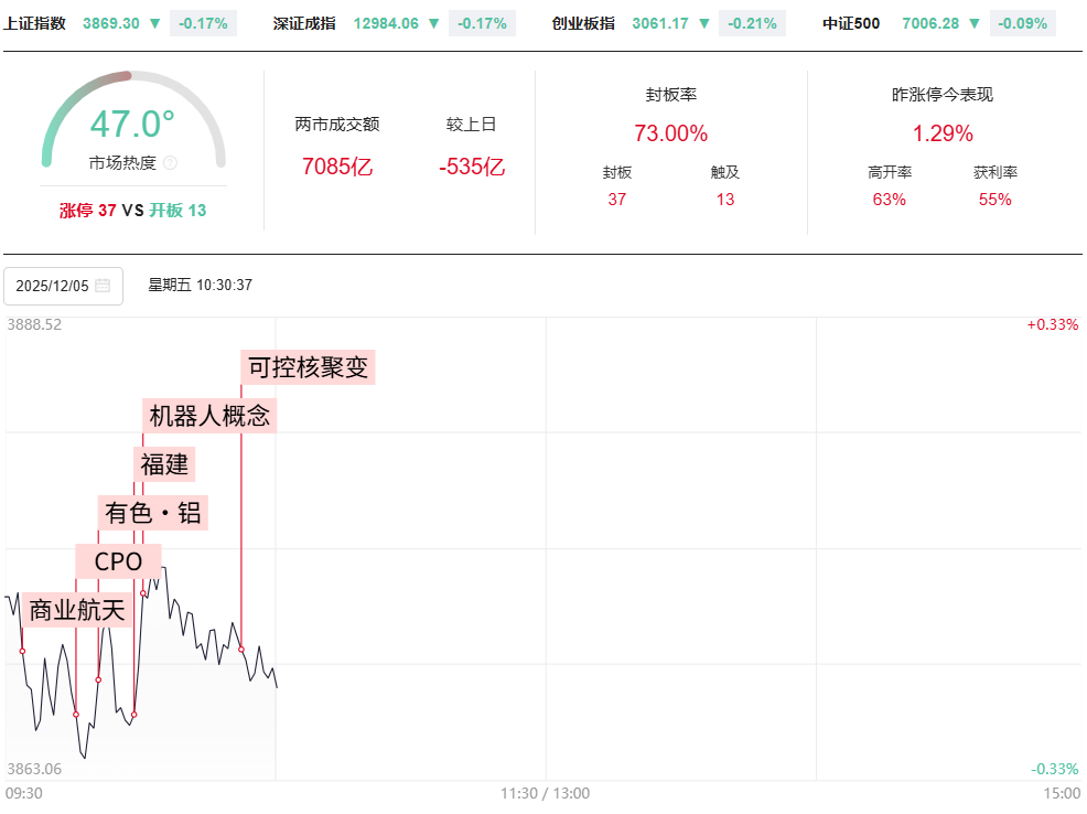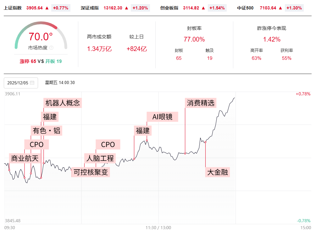 【午评:创业板指半日涨0.47% 商业航天、福建板块持续走强】财联社12月5日电,市场早盘探底回升,三大指数集体翻红。沪深两市半日成交额9927亿,较上个交易日缩量394亿。盘面上热点快速轮动,全市场超3500只个股上涨。从板块来看,福建板块持续爆发,海欣食品8天7板,安记食品、太阳电缆双双4连板,舒华体育2连板。算力硬件概念快速走强,长光华芯20cm涨停创历史新高。商业航天概念股延续强势,顺灏股份6天5板,龙洲股份3连板。人形机器人概念表现活跃,骏亚科技3连板,中坚科技涨停。下跌方面,银行板块