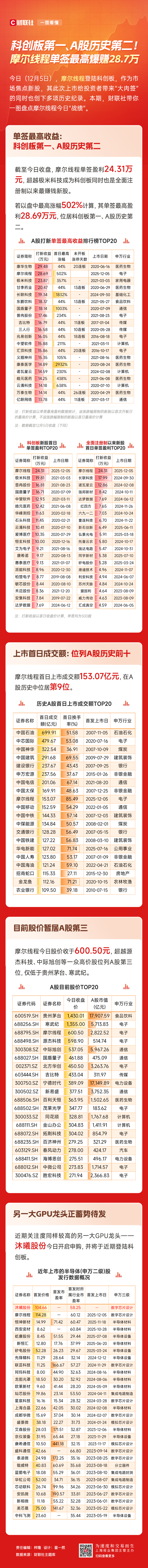 【一图看懂:摩尔线程单签最高盈利28.7万 股价站稳600元位居A股第三】财联社12月5日电,今日(12月5日),GPU龙头摩尔线程正式登陆科创板,截至收盘,公司股价首日涨幅达425.46%,按单签500股计算,打新投资者首日盈利规模高达24.31万元,不仅超越2021年3月上市的极米科技(单签盈利19.81万元),登顶科创板“最赚钱新股”宝座,同时也是全面注册制以来打新收益最高的新股。若以盘中最高价核算,摩尔线程单签最高盈利达28.69万元,该数据位居科创板第一、A股历史第二。值得注意的是,摩