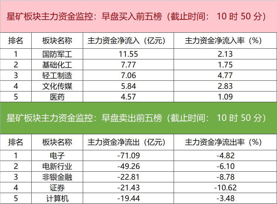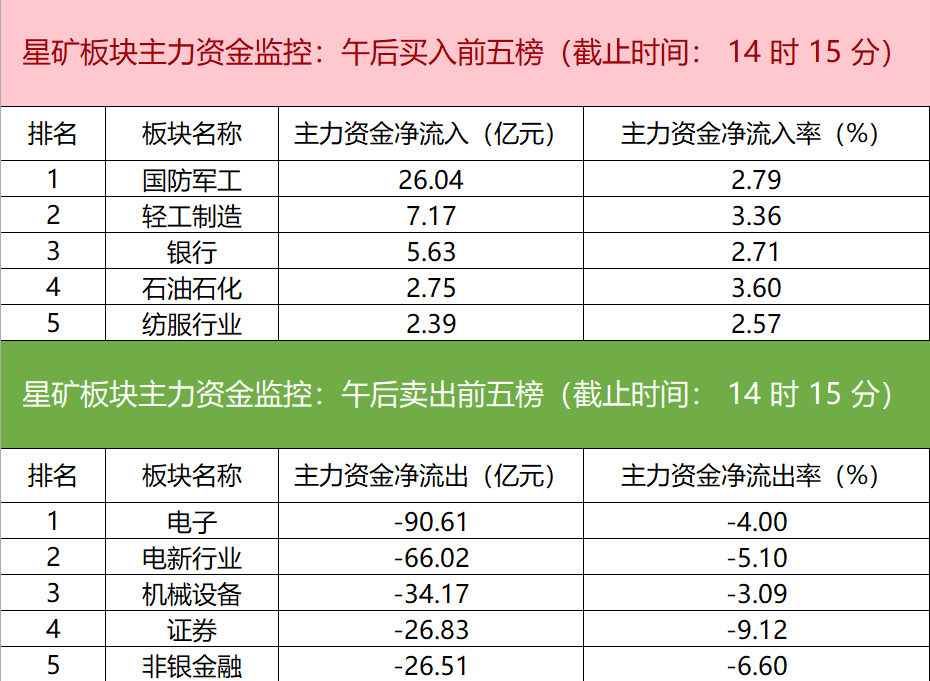【主力资金监控:电子板块净流出超90亿】财联社12月18日电,财联社星矿数据显示,今日主力资金净流入国防军工、轻工制造、银行等板块,净流出电子、电新行业、机械设备等板块,其中电子板块净流出超90亿元。个股方面,凯美特气资金净买入8.08亿元位居首位,中国卫星、兆易创新、顺灏股份主力资金净流入居前;工业富联遭净卖出超21亿元位居首位,宁德时代、英维克、阳光电源主力资金净流出额居前。