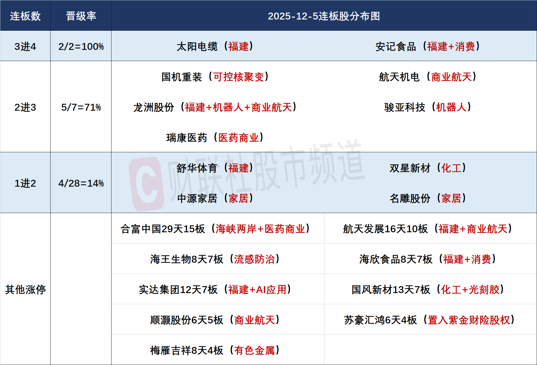 【12月5日涨停分析】财联社12月5日电,今日全市场共73股涨停,连板股总数11只,21股封板未遂,封板率为78%(不含ST股、退市股)。焦点股方面,福建本地股再度爆发,海欣食品8天7板、实达集团12天7板、太阳电缆与安记食品4连板;商业航天概念股延续强势,航天发展16天10板、顺灏股份6天5板。