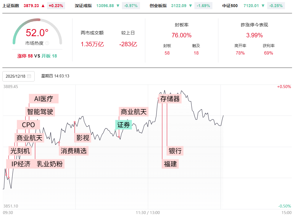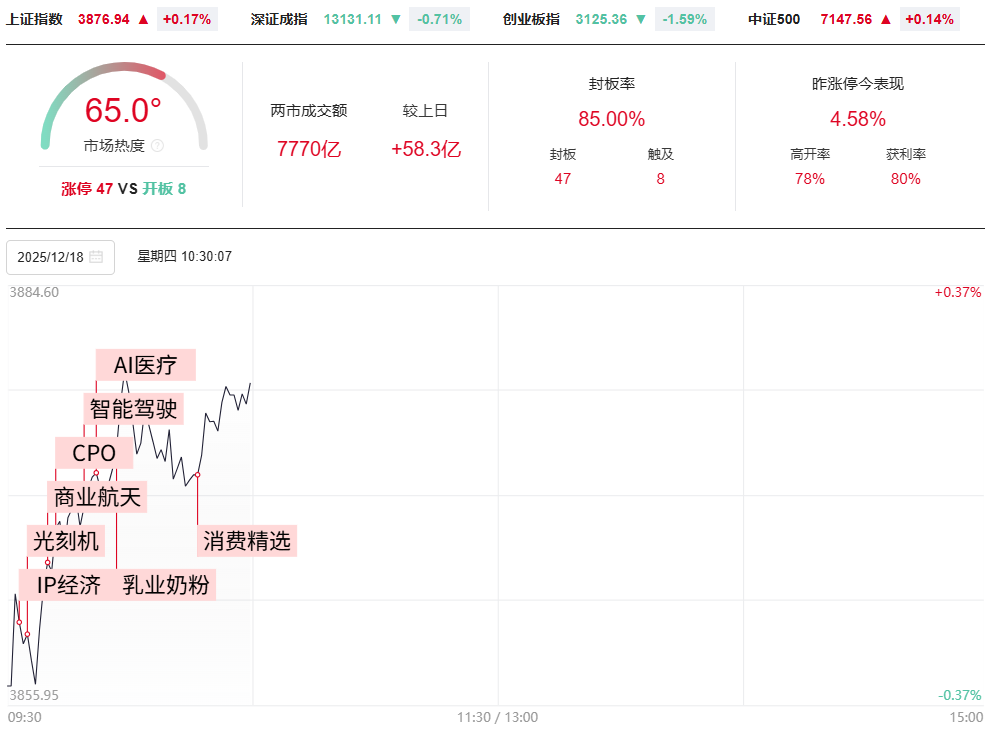 【午评:创业板指半日跌近2% 商业航天概念集体上涨】财联社12月18日电,三大指数涨跌不一,沪指拉升翻红,创业板指跌近2%。黄白线明显分化,微盘股指数涨超2%。沪深两市半日成交额1.05万亿,较上个交易日放量212亿。盘面上热点快速轮动,全市场超3600只个股上涨。从板块来看,商业航天概念再度爆发,盛洋科技2连板,顺灏股份、天银机电、中国卫星等多股涨停。大消费板块走强,零售方向领涨,中央商场、上海九百涨停。IP经济概念表现活跃,广博股份、三湘印象涨停。AI医疗概念震荡拉升,华人健康20cm涨停。