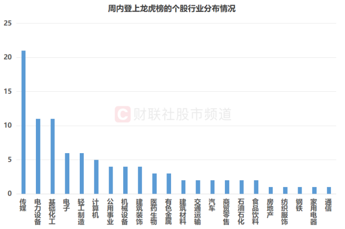 按行业层面(申万一级)统计,截至2月10日数据,剔除ST股,周内登上龙虎榜的95只个股中,传媒、电力设备、基础化工三大板块的个股数量明显较多,其分别占比22.1%、11.6%、11.6%,同时,电子、轻工制造、计算机、公用事业、机械设备、建筑装饰、医药生物、有色金属股数量也相对较多,占比均在3%以上。