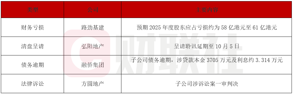 债市公告精选 | 路劲基建预亏逾58亿港元;弘阳地产清盘呈请延期