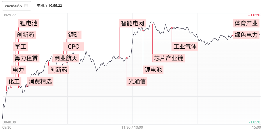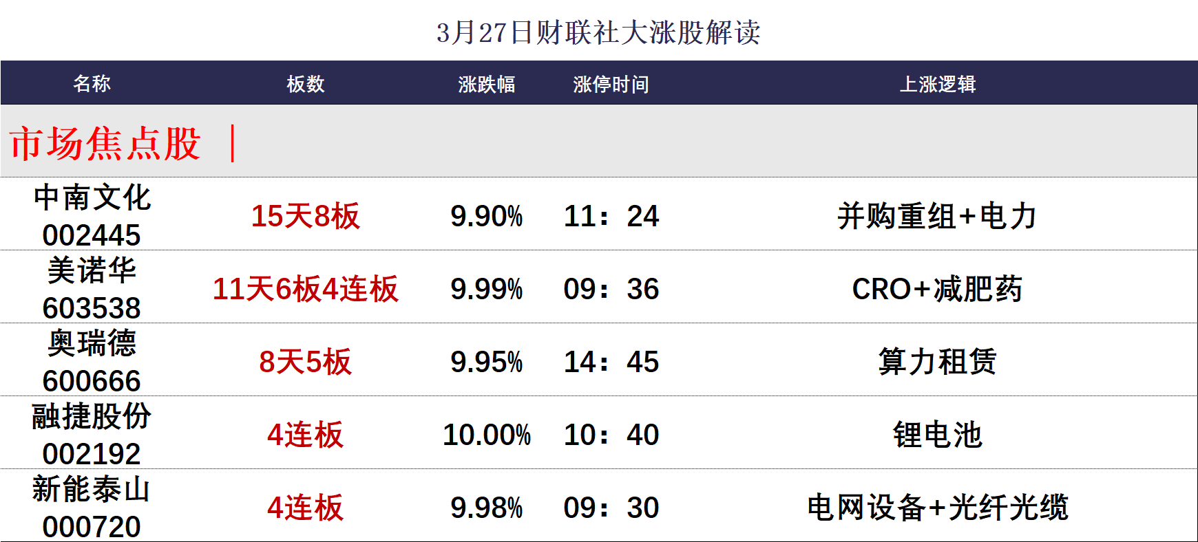3月27日讯,今日78股涨停,16股炸板,封板率为83%,新能泰山、融捷股份4连板,美诺华6天5板,中南文化15天8板,奥瑞德8天5板,万邦德、狮头股份、宁波能源4天3板,广西能源、石大胜华、云南锗业6天3板。市场低开高走,深成指涨超1%。沪深两市成交额1.85万亿,较上一个交易日缩量903亿。盘面上,市场热点快速轮动,全市场超4300只个股上涨。板块方面,能源金属、创新药、化工板块领涨;保险、电力、银行板块逆势下跌。截至收盘,沪指涨0.63%,深成指涨1.13%,创业板指涨0.71%。