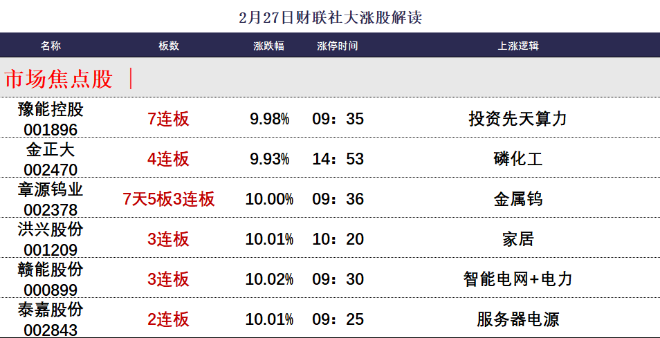 2月27日讯,今日75股涨停,16股炸板,封板率为82%,豫能控股7连板,金正大、章源钨业7天5板,赣能股份、洪兴股份3连板。市场全天震荡分化,沪指低开高走小幅收涨。沪深两市成交额2.49万亿,较上一个交易日缩量504亿。板块方面,小金属、酒店餐饮、培育钻石、稀土永磁板块领涨;玻璃玻纤、CPO、民航机场、工程机械方向领跌;截至收盘,沪指涨0.39%,深成指跌0.06%,创业板指跌1.04%。