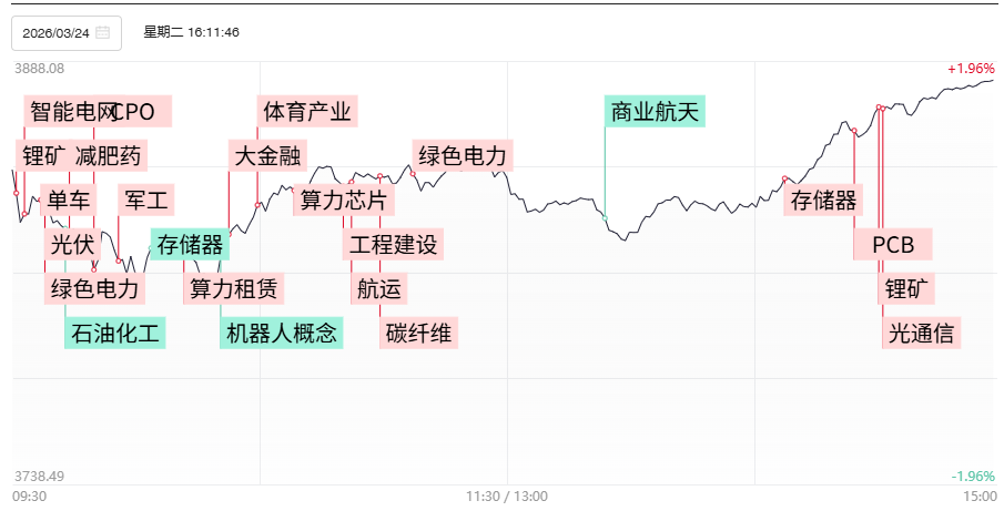 3月24日讯,今日83股涨停,23股炸板,封板率为78%,华电辽能7连板,中利集团3连板,中南文化12天7板,韶能股份5天4板,雅博股份、亚翔集成8天4板,粤电力A、奥瑞德5天3板。市场全天探底回升,沪指、深成指均涨超1%,创业板指尾盘翻红,此前一度跌近2.5%。黄白线分化明显,微盘股指数大涨超5%。沪深两市成交额2.08万亿,较上一个交易日缩量3487亿。盘面上,市场热点快速轮动,全市场超5100只个股上涨。板块方面,军工、环保、CXO、算力硬件方向领涨;油气、煤炭、养殖等少数板块下跌。截至收盘,沪指涨1.78%,深成指涨1.43%,创业板指涨0.5%。