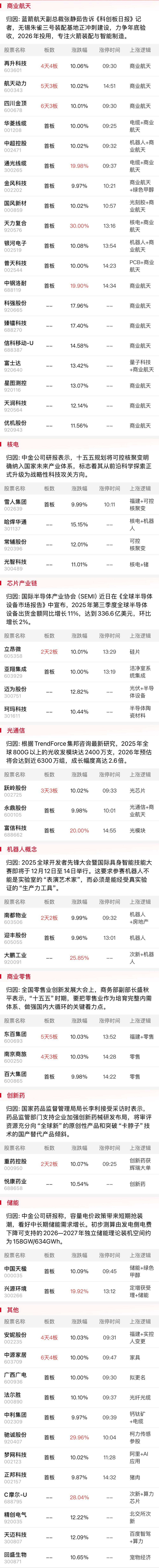 国内商业航天巨头蓝箭航天表示,无锡朱雀三号装配基地正冲刺建设,力争年底验收,2026年投用,专注火箭装配与智能制造,朱雀三号的终极目标是将每公斤发射费用降至2万元人民币以下。商业航天概念维持近期高活跃度,但除去再升科技晋级4连板外,其余近期高位股表现相对乏力,龙洲股份一度逼近跌停,航天发展等航天系方向人气股分化,仅有航天动力实现反包涨停。随着北交所天力复合午后封30厘米涨停,带动上游材料方向以及可控核聚变、量子科技等低位题材扩散,一方面反映商业航天概念当前人气地位仍难撼动,但每天领涨股的不断切换仍反映市场短期风偏不足的隐忧,盲目追涨风险不低。
