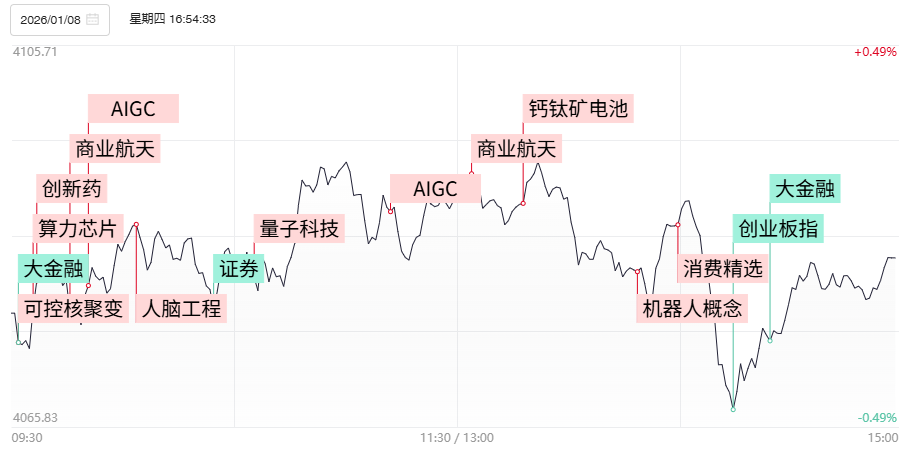 1月8日讯,今日92股涨停,29股炸板,封板率为76%,锋龙股份10连板,志特新材20cm4连板,美克家居、快意电梯、普利特、创新医疗、银河电子、岩山科技4连板,鲁信创投10天8板,神剑股份14天10板,南兴股份6天5板,金风科技9天5板。沪深两市成交额2.8万亿,较上一个交易日缩量538亿,成交额连续4个交易日超2.5万亿。盘面上,市场热点快速轮动,全市场超3700只个股上涨。板块上,商业航天、脑机接口、可控核聚变、AI智能体涨幅居前;保险、证券、有色金属、稀土、电池板块领跌。截至收盘,沪指跌0.07%,深成指跌0.51%,创业板指跌0.82%。
