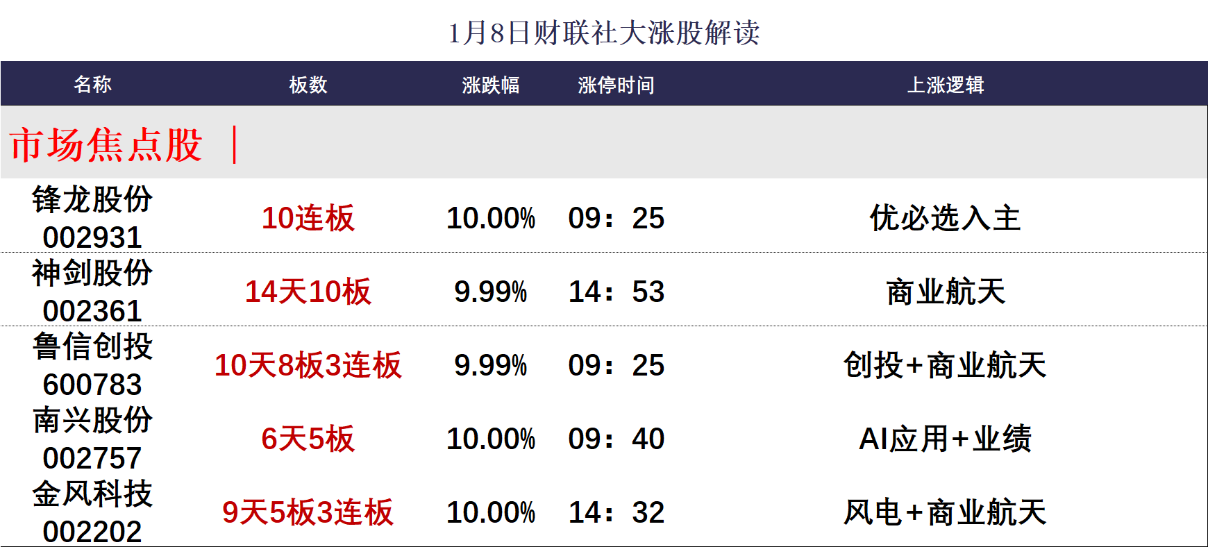 国内首个海上回收复用火箭产能基地—箭元科技中大型液体运载火箭总装总测及回收复用基地动工,建成后将具备年产25发“元行者一号”火箭的规模化制造能力。此前持续火爆表现的商业航天概念再掀高潮,鲁信创投、金风科技、银河电子、邵阳液压、江顺科技实现连板晋级,泰胜风能、海兰信、航天宏图等众多低位20厘米个股封板。随着板块内高位股批量迭创历史新高,资金向低位分支扩散,叠加海上火箭回收的杭萧钢构一字涨停,引发钙钛矿电池为代表的太空光伏概念展开批量补涨,乾照光电、钧达股份、迈为股份、奥特维、东方日升等悉数创出历史或阶段新高。无论是海外的SpaceX还是国内的蓝箭航天等,可回收火箭仍是当前的核心方向,仍应关注人气标鲁信创投分歧后的资金承接,而太空光伏、太空算力等低位分支虽然有利板块体量的横向扩大,但这些细分能否持续加强,其中能否涌现出更多的新高个股仍至关重要。