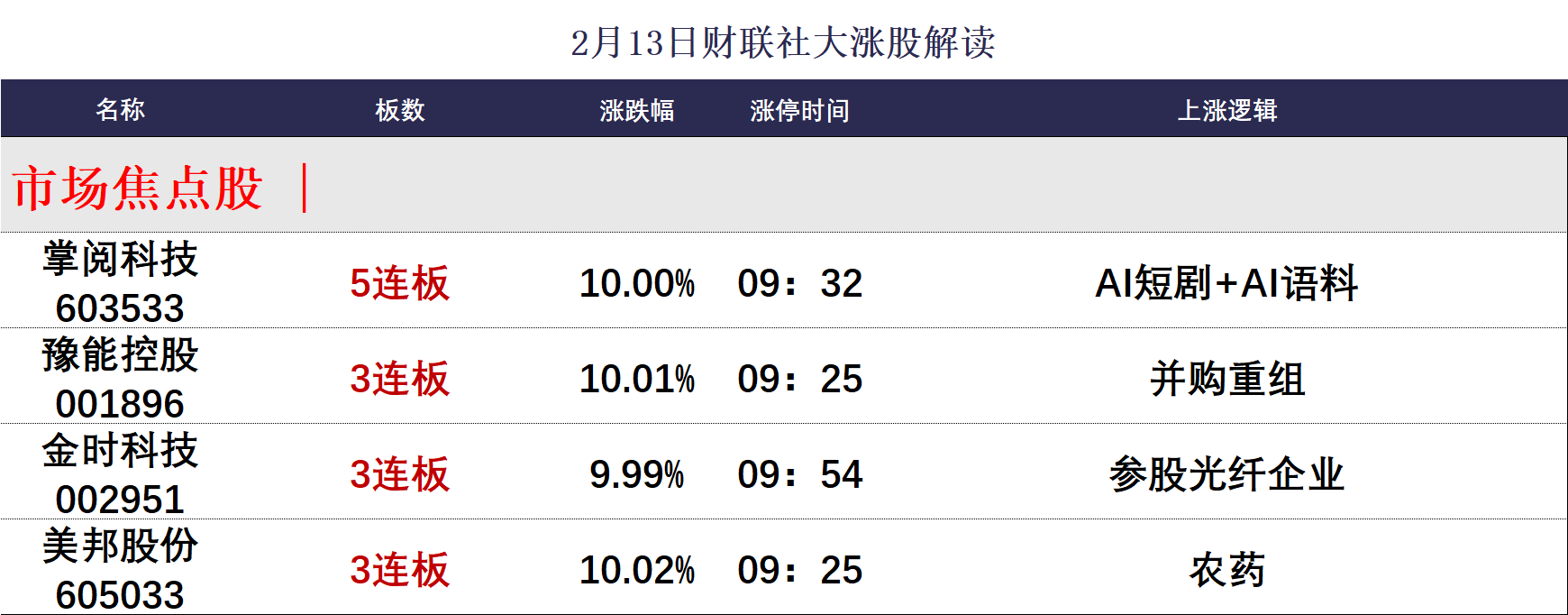 2月13日讯,今日32股涨停,11股炸板,封板率为74%,掌阅科技5连板,豫能控股、美邦股份、金时科技3连板,风语筑5天3板。蛇年收官日A股三大指数全天低开低走,全市场超3800股下跌。沪深两市成交额1.98万亿元,较上一日缩量1591亿元。板块方面,军工、影视、造纸、半导体设备板块涨幅靠前;光伏、有色、油气、航运板块跌幅靠前。截至收盘,上证指数跌1.26%,深成指跌1.28%,创业板指跌1.57%。