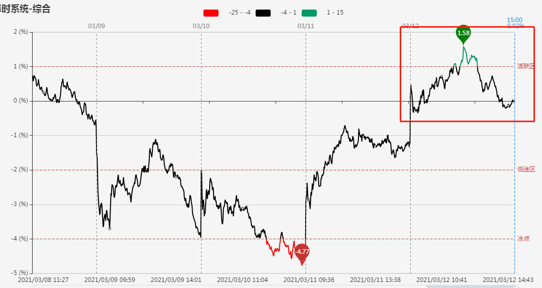 指标显示,市场短线情绪竞价回升至0轴附近,早盘冲高一度进入活跃区。午后,进入回落状态,收盘再次回到0轴附近。全天与指数背离,指数今日是走V型,情绪则是倒V型。