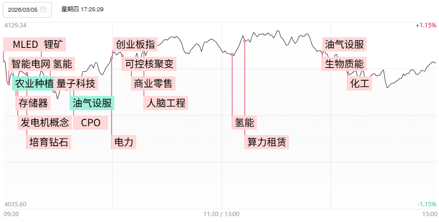 随着此前4连板的高标股水发燃气封跌停,加上洲际油气在内的多只油气板块连板人气股晋级失败,市场连板高度降至2板,短线情绪继续承压。油气、航运等中东局势相关方向继续展开巨震分歧的同时,昨日大面积补涨的农业、军工板块走出“一日游”行情。受今日政府工作报告发布消息刺激,报告中提到的绿色能源以及未来经济出现不同程度走强,包括可控核聚变、脑机、绿电、绿氢等方向均大幅冲高。此外MicroLED概念爆发,名称带“光电”个股掀涨停潮。与昨日“XX智能”个股大涨类似,这类量化资金主导下的热度横向集中扩散,其持续性和高度仍然存疑虽然当前市场短线情绪触及冰点,但科技股盘中与能源线之间的多次流动性争夺,市场赚钱效应想要走出像样修复仍有较大难度。