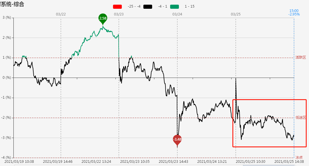 指标显示,市场短线情绪开盘小幅回落,今日主要在低迷区下方与冰点上方震荡,尾盘回落收在冰点上方。明日,可以关注短线情绪冰点之后是否能够迎来回暖。