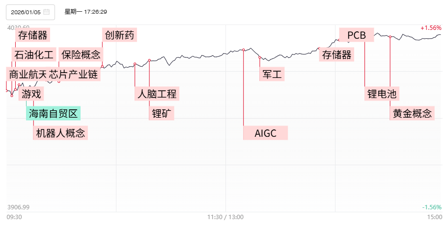 1月5日讯,今日108股涨停,26股炸板,封板率为81%,锋龙股份7连板,雷科防务4连板,南兴股份、友邦吊顶3连板,蓝色光标20cm2连板,圣晖集成9天5板。市场高开高走迎来2026年开门红,创业板指领涨,沪指重回4000点上方,录得十二连阳。沪深两市成交额高达2.55万亿,较上一个交易日放量5011亿。盘面上,全市场超4100只个股上涨。板块题材上,脑机接口、创新药、保险、存储芯片板块涨幅居前;海南自贸区、旅游酒店、猪肉、银行等板块领跌。