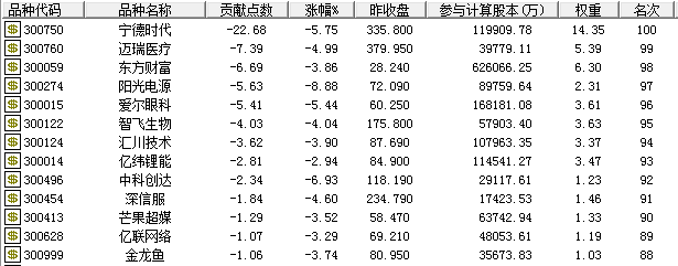 指数方面,受消息影响大幅低开,但是个股、题材表现还行。竞价高开个股仅有350只,收涨个股达到1700余只。创业板指贡献度上看,对指数形成正反馈最高的个股迈克生物仅0.51点,但是指数负反馈贡献度,宁德时代达到22.68点,还有迈瑞医疗、东方财富、阳光电源等也是这波指数杀跌上榜的常客。