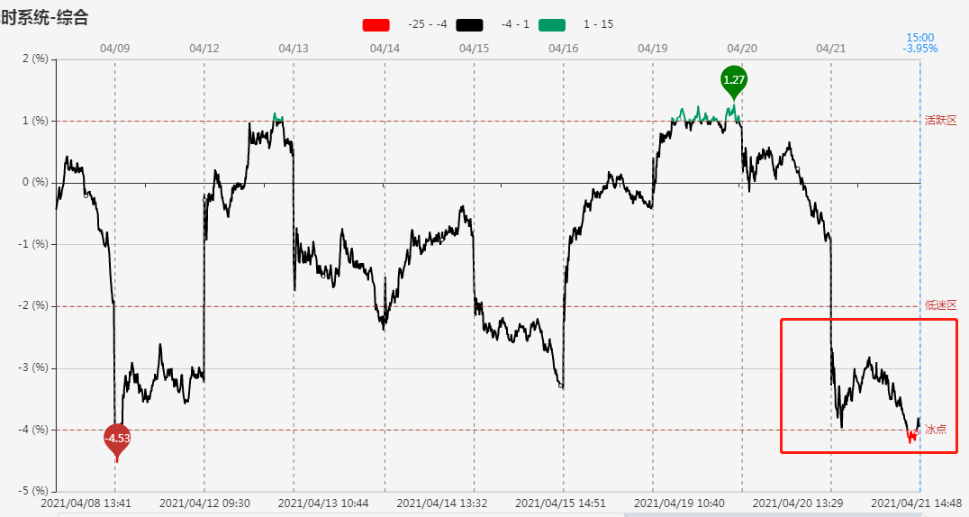 指标显示,市场短线竞价大幅回落,早盘在冰点附近小幅回升,午后再度回落,尾盘一度进入冰点。