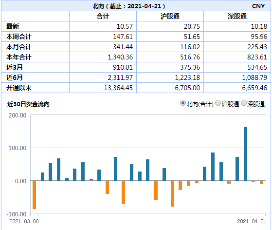 北向资金,今日净卖出10.57亿元。其中,沪市净卖出20.75亿元,深市净买入10.18亿元。