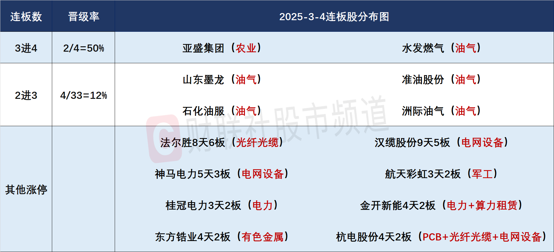 连板晋级率降至18.9%,亚盛集团、水发燃气实现3进4。近期火热的油气、航运等中东局势相关方向呈现两极分化,洲际油气、准油股份等多股晋级3连板的同时,长江能科、德石股份、特瑞斯等多只20、30厘米个股跌超10%。油气等方向分歧之际,具备抗通胀属性的农业、化工以及中东局势相关的无人机为首的军工等低位方向相继展开轮动修复,反映当前短线资金的避险意愿依旧高企。此外随着短线接力情绪降温,部分趋势抱团方向重新获得资金回流,电网设备、绿电绿氢产业链展开强修复,杭电股份、神马电力等多股实现反包涨停,算力硬件端也出现局部修复。整体而言,在油气等当前主线分歧之际,超跌以及趋势抱团方向仍呈现快速轮动,反映当前市场整体风偏改善仍较为有限。
