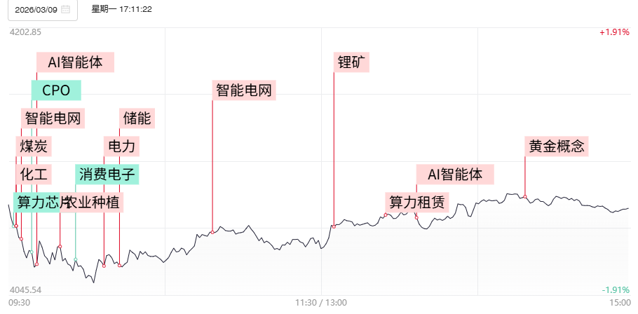 连板股晋级率降至37.5%,除去2只个股实现3进4外,仅有美利云实现晋级3连板。不过市场整体情绪仍处于回暖态势,发布可能申请停牌核查公告的算电协同概念人气股豫能控股全天呈现低开高走行情,盘中续创阶段新高,支撑所属的绿电以及算力租赁概念维持强势,多只趋势抱团股继续向上展开加速。随着上周末OpenClaw消息面持续发酵,OpenClaw概念以及算力租赁相关产业链再度掀起涨停潮。而随着国际油价盘中冲高回落,人气龙山东墨龙、洲际油气等炸板回落逼近翻绿,引发能化产业链后排股展开补跌。可见科技与涨价概念间跷跷板行情依旧,短线风格剧烈切换仍是大概率事件。