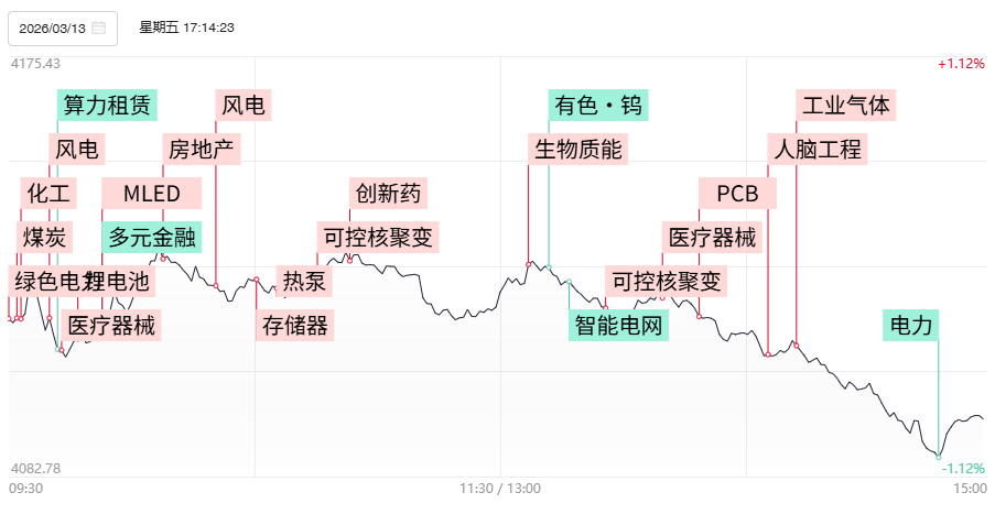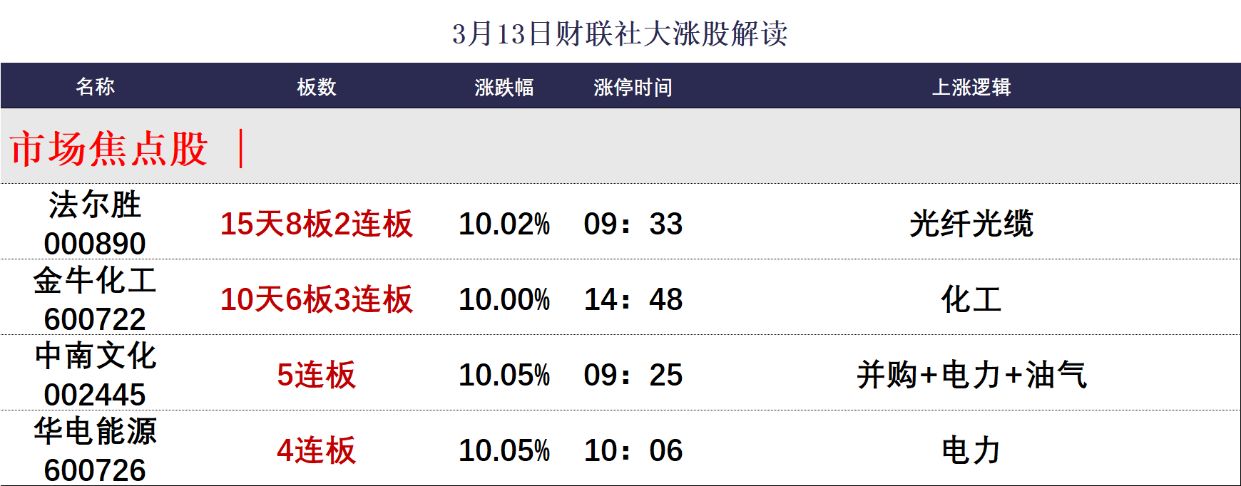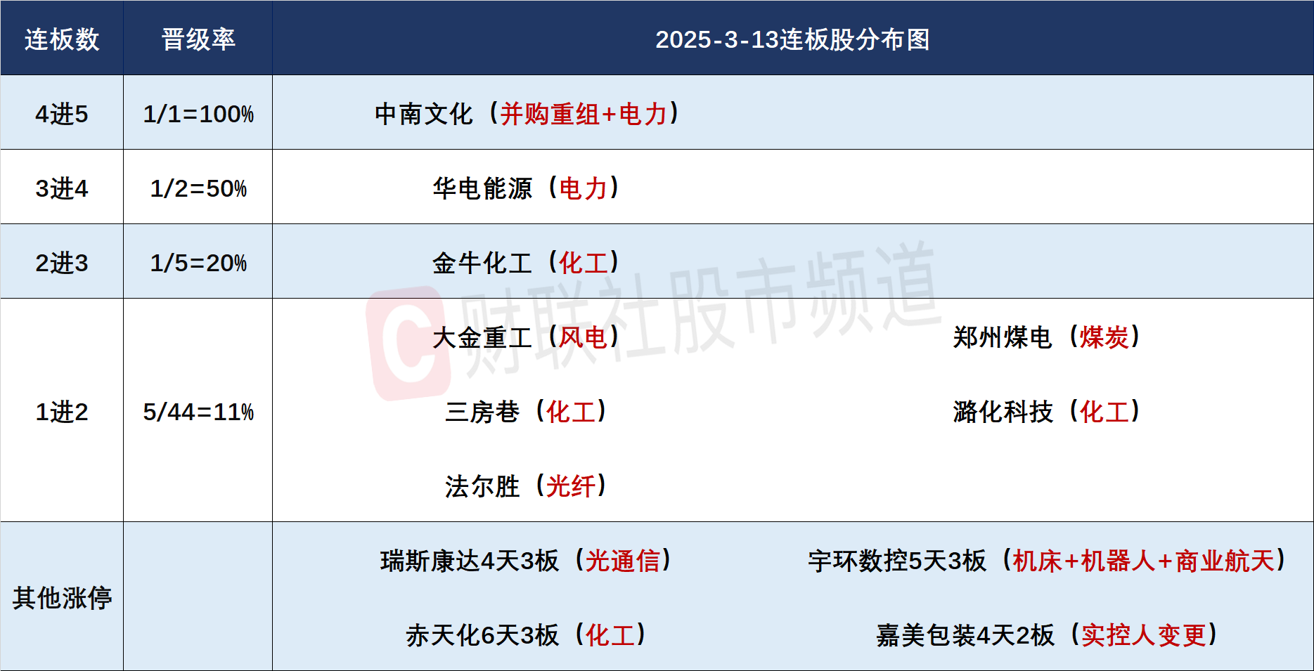 3月13日讯,今日59股涨停,18股炸板,封板率为77%,中南文化5连板,华电能源4连板,金牛化工10天6板,法尔胜15天8板,赤天化13天5板,瑞斯康达4天3板,宇环数控5天3板。市场全天震荡调整,尾盘快速下挫,沪指盘中跌超1%。沪深两市成交额2.4万亿,较上一个交易日缩量416亿。盘面上,局部热点反复走强,个股跌多涨少,全市场超3800只个股下跌。板块方面,风电设备、化工、酿酒板块涨幅靠前;算力租赁、小金属、电网设备、商业航天跌幅靠前。