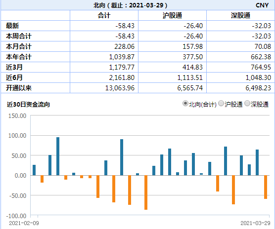 北向资金,今日净卖出58.43亿元。其中,沪市净卖出26.4亿元,深市净卖出32.03亿元。