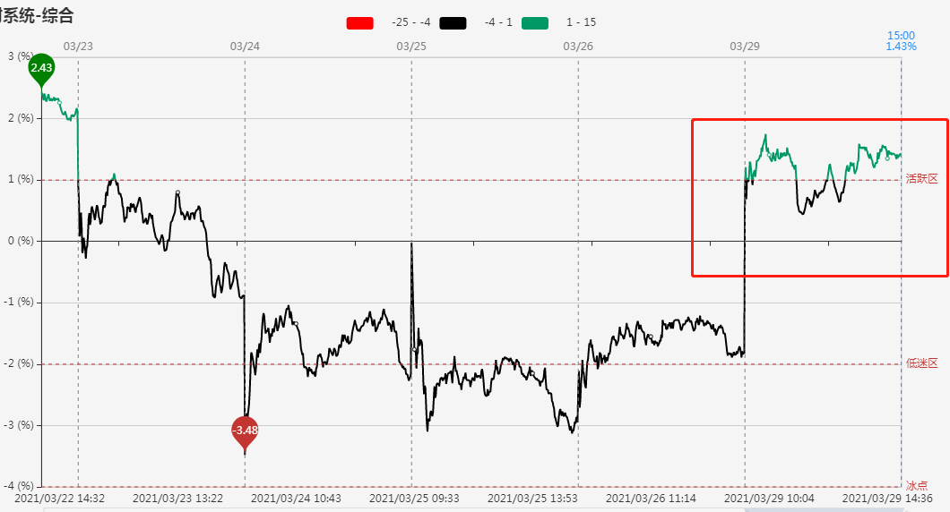 指标显示,市场短线情绪开盘大幅回升,全天大部分时间都处于活跃区上方震荡。