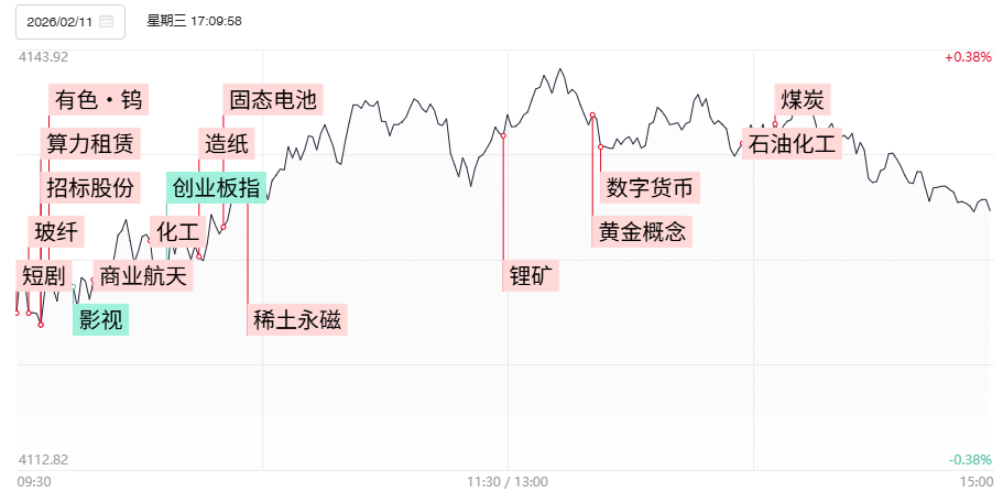 2月11日讯,今日51股涨停,17股炸板,封板率为75%,百川股份11天8板,大位科技、德才股份、掌阅科技、欢瑞世纪、龙韵股份3连板,吉华集团、金富科技5天4板。三大指数涨跌不一,创业板指、科创50指数跌超1%。时隔31个交易日,沪深两市成交额跌破2万亿,较上一个交易日缩量1213亿。盘面上,全市场超3200只个股下跌。板块方面,化工、小金属、算力租赁、玻纤板块领涨;影视、CPO、旅游酒店等方向领跌。截至收盘,沪指涨0.09%,深成指跌0.35%,创业板指跌1.08%。