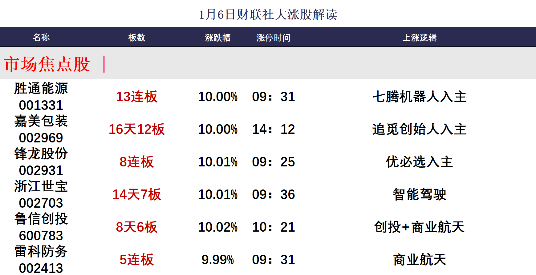 1月6日讯,今日120股涨停,25股炸板,封板率为83%,胜通能源13连板,锋龙股份8连板,雷科防务5连板,友邦吊顶、南兴股份4连板,索菱股份、城建发展、农心科技3连板,嘉美包装16天12板,浙江世宝14天7板,鲁信创投8天6板,北斗星通10天5板,中国卫通6天4板。三大指数集体收涨,沪指高开高走,日线录得13连阳,再创十年新高。量能持续放大,沪深两市成交额2.81万亿,较上一个交易日放量2602亿。板块方面,脑机接口、化工、有色金属板块涨幅居前;美容护理、CPO、银行板块表现相对落后。