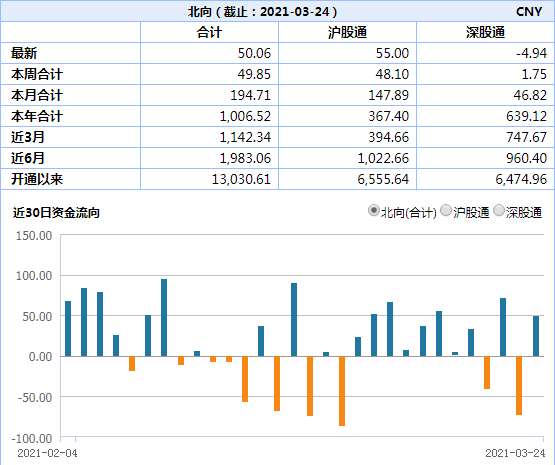 北向资金,今日净买入50.06亿元。其中,沪市净买入55亿元,深市净卖出4.94亿元。