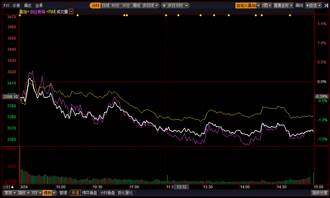 指标显示,市场短线情绪竞价回落至低迷区下方,开盘小幅回升,盘中主要在低迷区和0轴之间震荡。