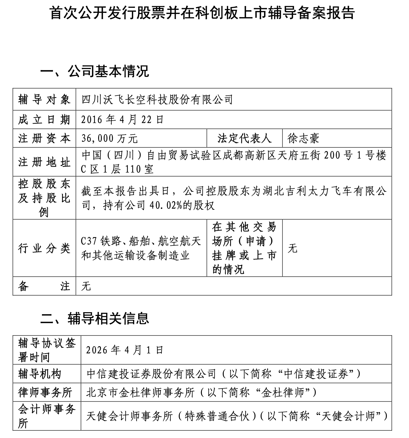 其辅导备案显示,沃飞长空注册资本3.6亿元,法定代表人为吉利集团CEO徐志豪。截至报告出具日,该公司控股股东为吉利科技集团全资子公司湖北吉利太力飞车有限公司,其持有沃飞长空40.02%股权。
