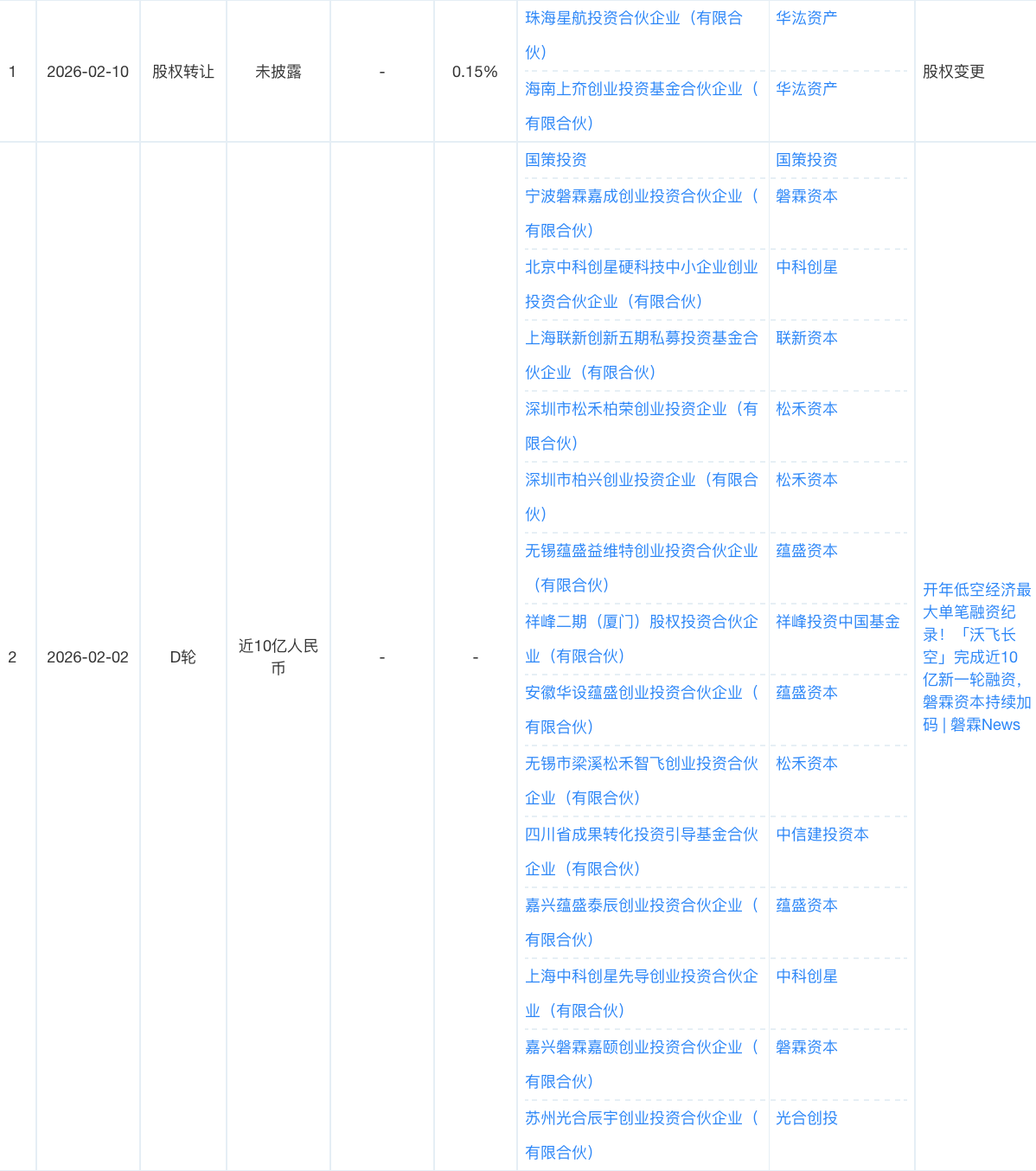 工商信息显示,截至目前,沃飞长空已历经九轮融资,包括八轮融资和一次股权转让。其D轮融资于2026年2月完成,此次融资不仅高达近10亿元,还创下2026开年低空经济最大单笔融资。
