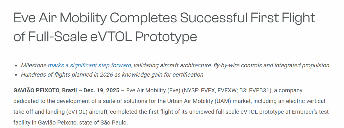 Eve表示,此次测试验证了飞行器架构、电传飞控系统以及集成推进系统的性能。首飞时间符合公司此前公布的在2025年底或2026年初完成首飞的目标。